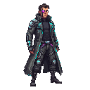 "Male hacker with cybernetic eye implant, wearing a long coat" - created using the protagonist as reference